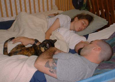 Here we are, all asleep. That's our cat, Roxy, in there. She's a bed hog.
