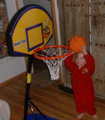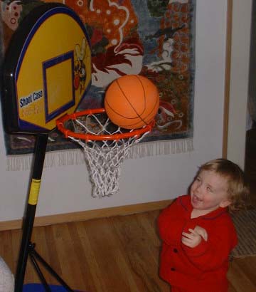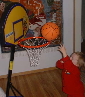 Alec makes his first shot. Dad is seen making the same shot days later after an unknown number of attempts.